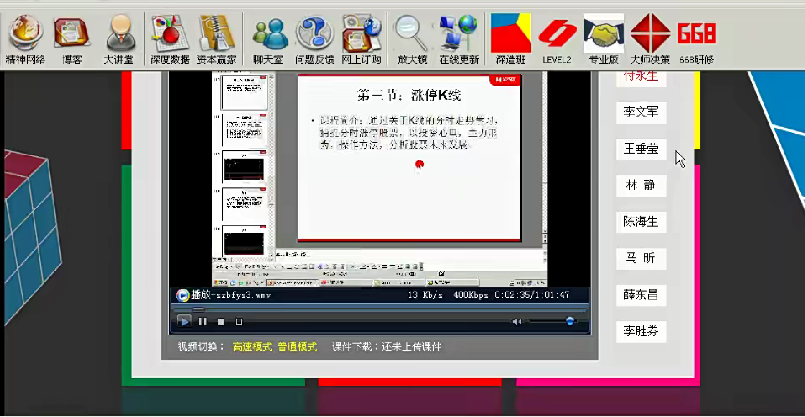 [股票课程]付永生 高级K线组合战法股票视频课程 课程目录 持续K线上.wmv 持续K线下.wmv 高级K线组合战法.ppt 趋势转折k线1.wmv 趋势转折K线2.wmv 涨停K线.wmv 资源下载下载价格9 积分VIP免费立即购买目前永久VIP仅22元,免费下载全站资源! 0 付永生股票课程