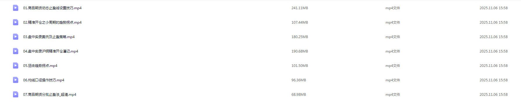 [期货课程]商品期货实战绝技100招 共7集视频 课程目录 01.商品期货动态止盈线设置技巧.mp4 02.精准开仓之小周期的趋势拐点.mp4 03.盘中实录案例及止盈策略.mp4 04.盘中实录沪铜精准开仓谨记.mp4 05.狙击趋势拐点.mp4 06.均线口径操作技巧.mp4 07.商品期货分批止盈法_超清.mp4 资源下载下载价格9 积分VIP免费立即购买目前永久VIP仅22元,免费下载全站资源! 0 商品期货实战绝技100招期货课程
